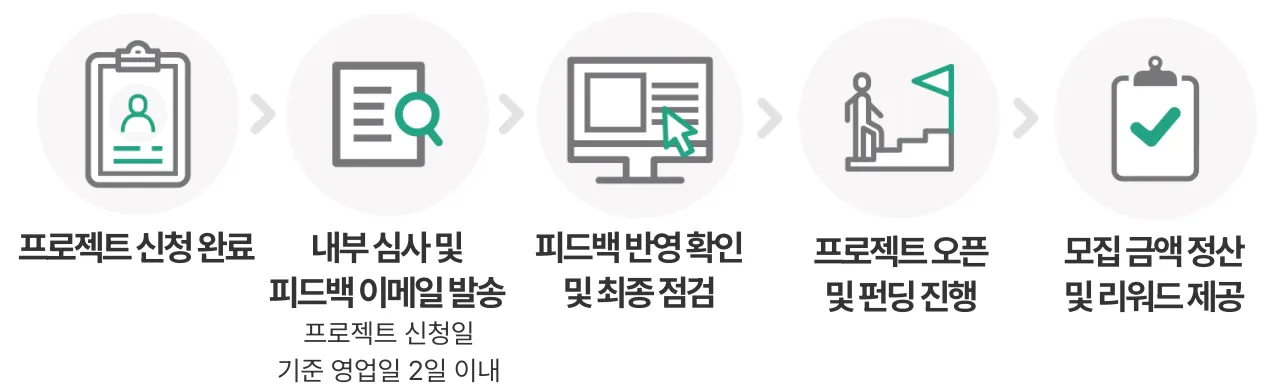 프로젝트 후원과 동시에 결제가 진행되며, 목표 금액을 달성하지 못하더라도 예정된 리워드를 제공하고, 모집금액에서 수수료를 제한 나머지 금액을 정산합니다.