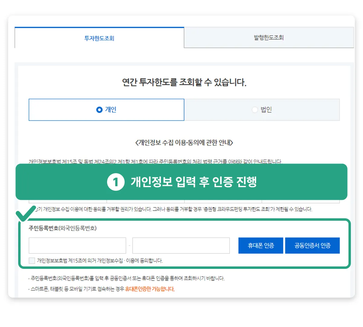 본인인증 진행 > 주민등록번호 입력 후 > 휴대폰 인증/공동인증서 인증