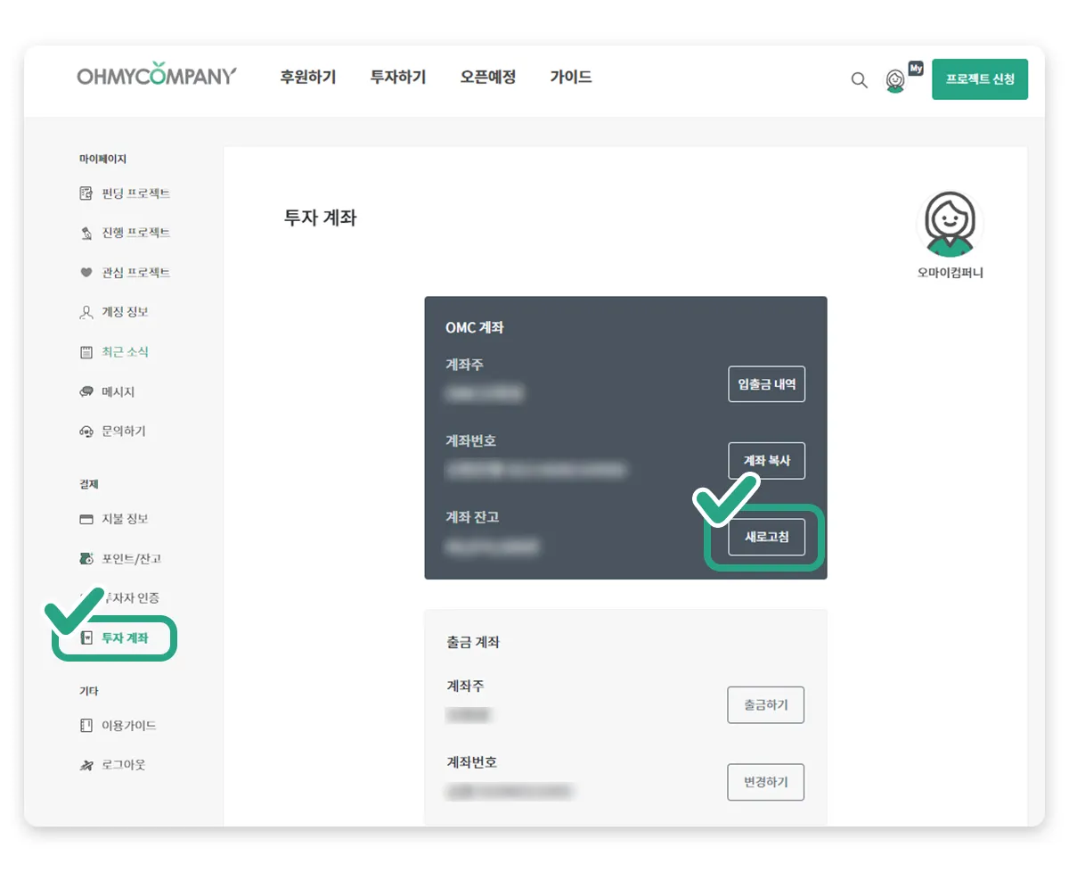 OMC 계좌 잔액 확인 및 투자금 입금