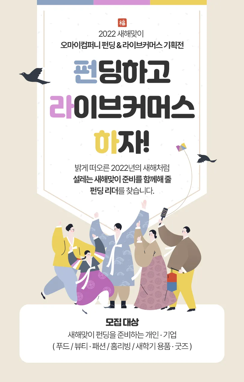 ○ 크라우드펀딩 플랫폼 오마이컴퍼니(공동대표 성진경, 한송이)가 오는 28일(금)까지 ‘2022 새해맞이 <펀딩 LIVE> 기획전(이하, 새해맞이 기획전)’을 통해 크라우드펀딩을 진행할 펀딩리더를 모집한다.