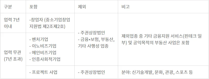 단, 벤처기업, 기술혁신형 중소기업(이노비즈기업), 경영혁신형 중소기업(메인비즈기업), 사회적기업 인증을 받았거나 비상장중소기업이 신기술개발, 문화사업 등의 프로젝트 사업*을 운영하는 경우 업력과 무관하게 크라우드펀딩에 참여하실 수 있습니다.