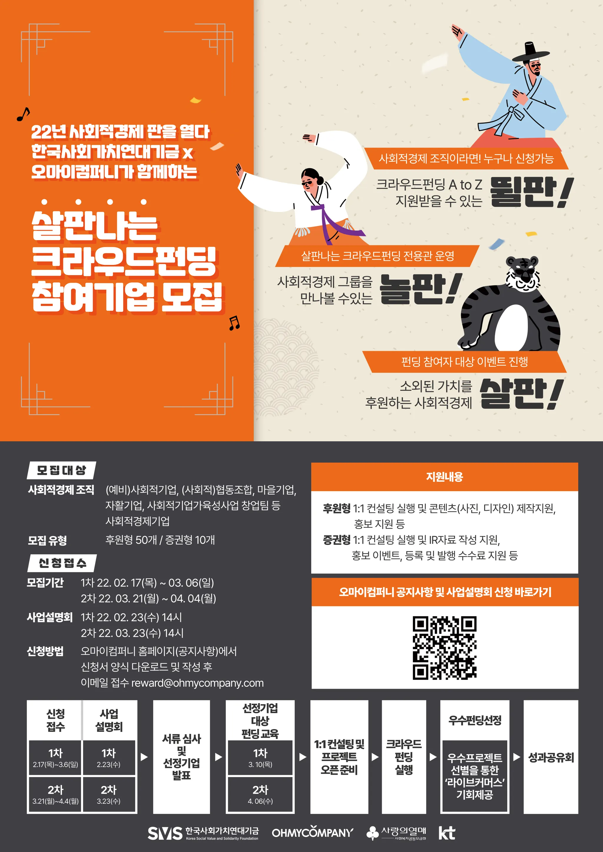 ○ 크라우드펀딩 플랫폼 오마이컴퍼니(공동대표 성진경, 한송이)가 사회적경제조직의 원활한 자금조달 및 판로개척을 위해 한국사회가치연대기금과 함께 '2022년 사회적경제 판을 열다! 사회적경제 크라우드펀딩 지원사업'을 진행해 크라우드펀딩을 진행할 사회적경제기업을 모집한다.